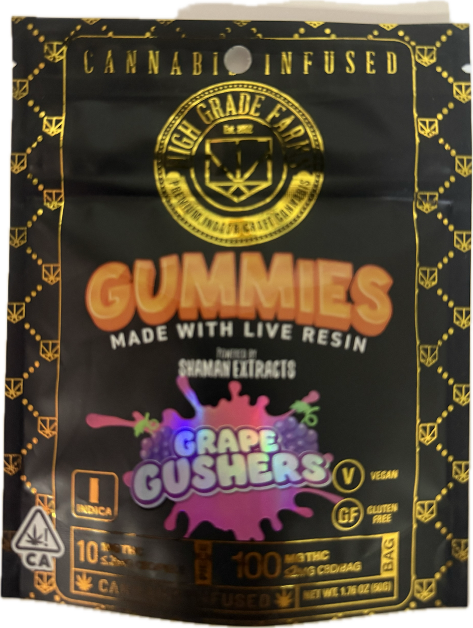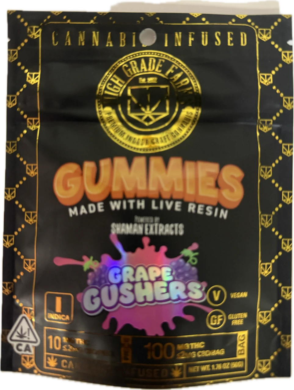 Live rosin Indica powerful gummy..Grape Gushers is a hybrid cannabis bred by High Grade Farms and made from crossing GMO x Gelato. Grape Gushers gets its name from its strong grape aroma, paired with a creamy mouthfeel and gassy berry notes. It has big blocky buds in deep purple, coated in milky trichomes, green highlights and amber hairs. Grape Gushers has an immediate relaxed and euphoric effect. It won the Gold Indoor and Best in California Co-Dominant Terpene categories for its abundance of myrcene, limonene, and caryophyllene at the 2023 California State Fair Cannabis Awards. If you’ve smoked, dabbed, or consumed Grape Gushers,
